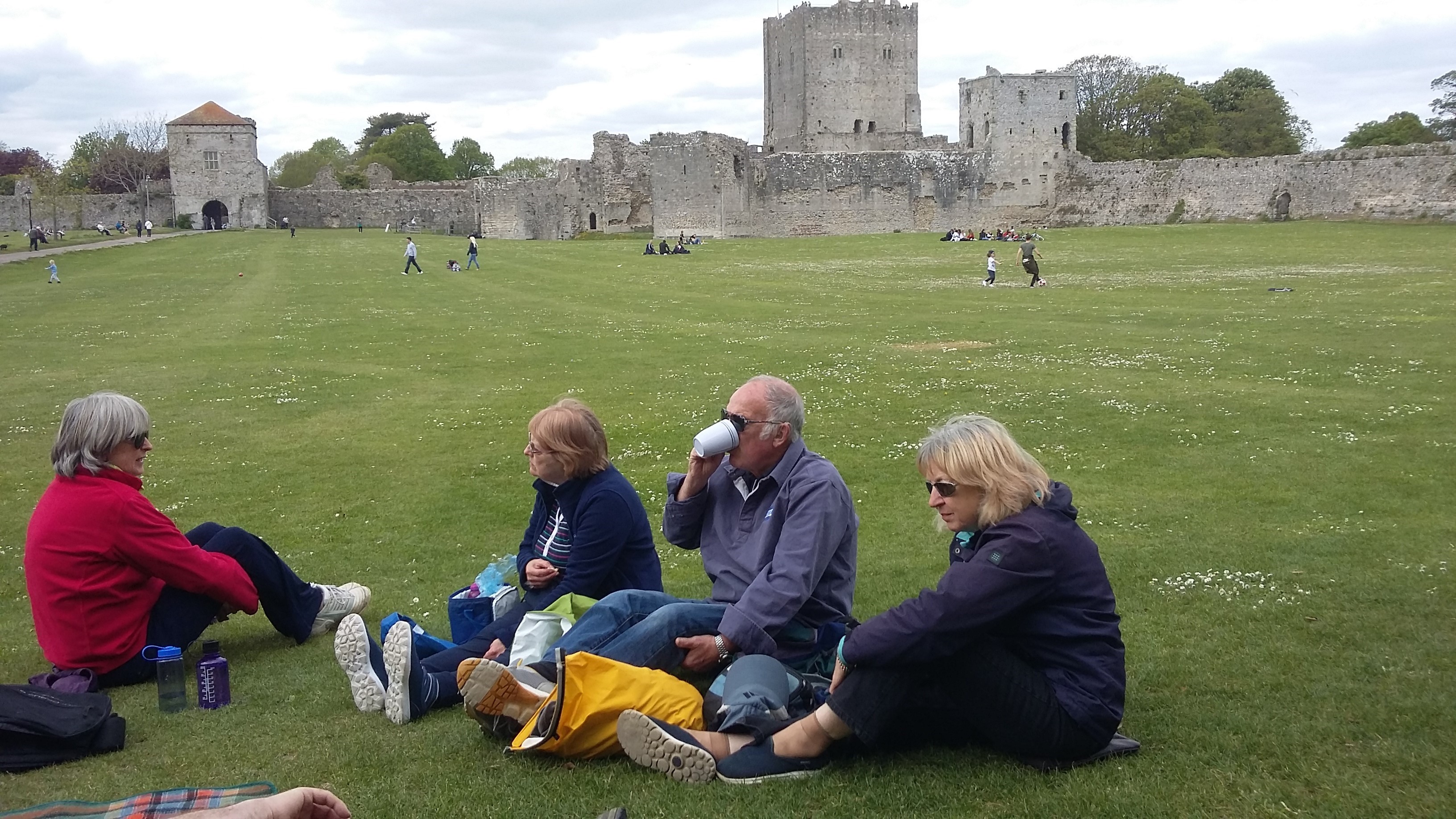 Two boats set off from Hardway slipway at 11.15 and rowed to Wicor Marine for a coffee at Salt Cafe, then rowed along the shoreline to Portchester Castle for a picnic lunch, returning to Hardway at 15.30 before the tide retreated.